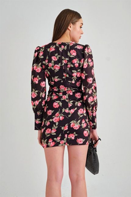 V-Neck Flower Crepe Dress Brown