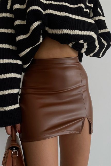 Slit Mini Leather Skirt Tan
