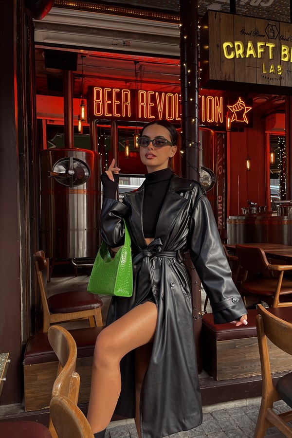 Colorful Lined Leather Trench Coat Black -17388