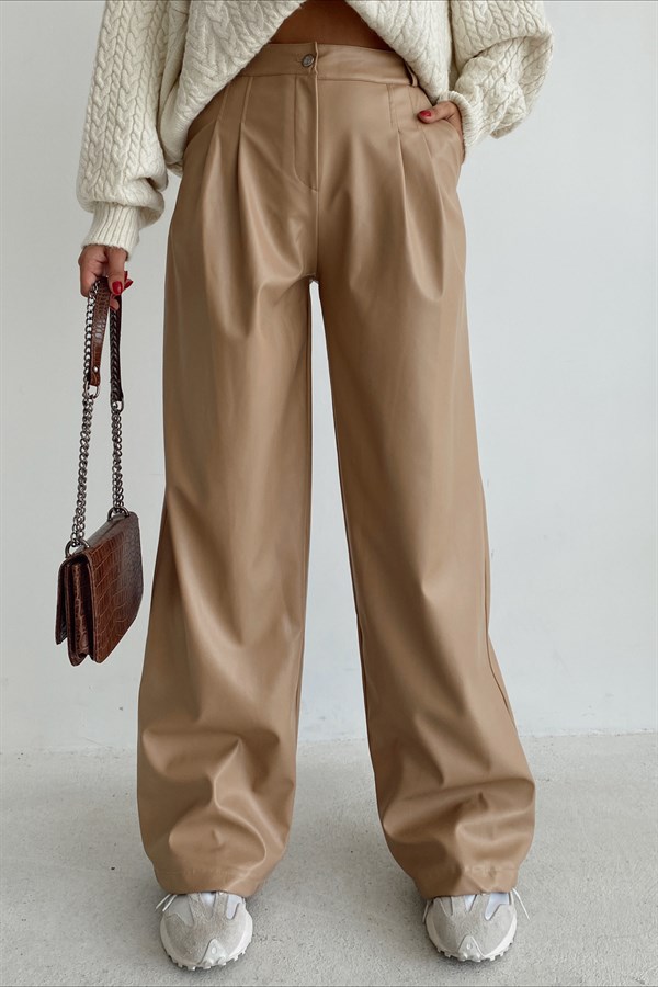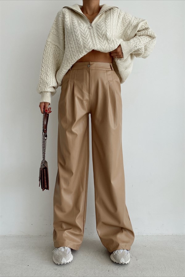 High Waist Leather Pants Beige -11715