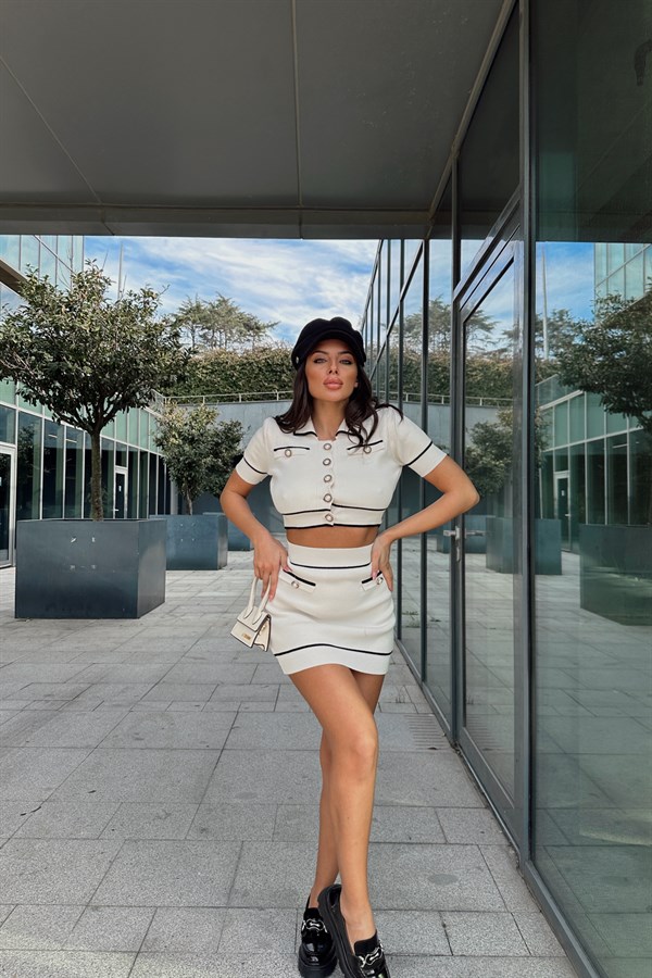Slim Buttoned Knitwear Skirt Suit Cream -80335